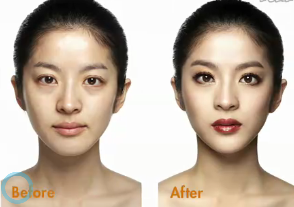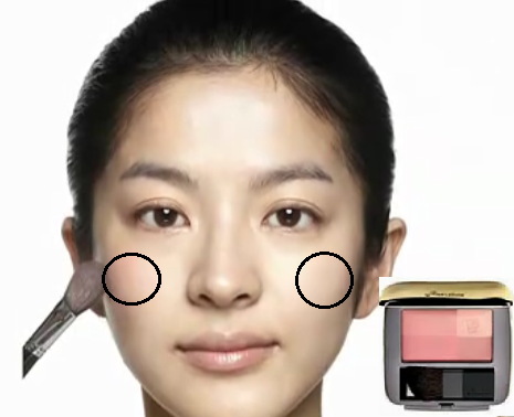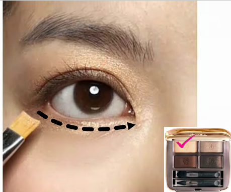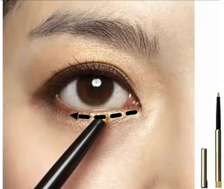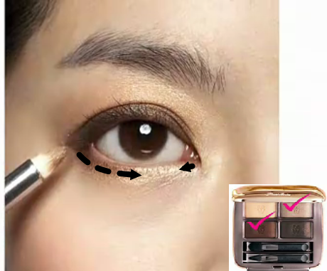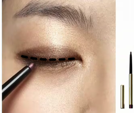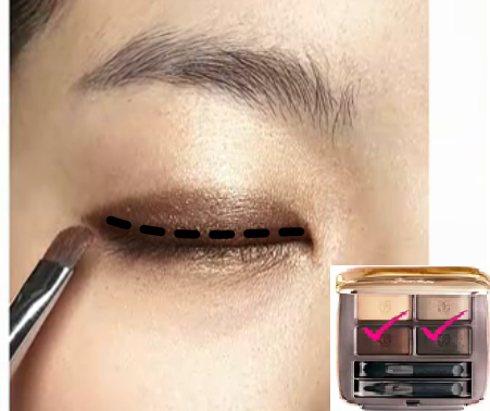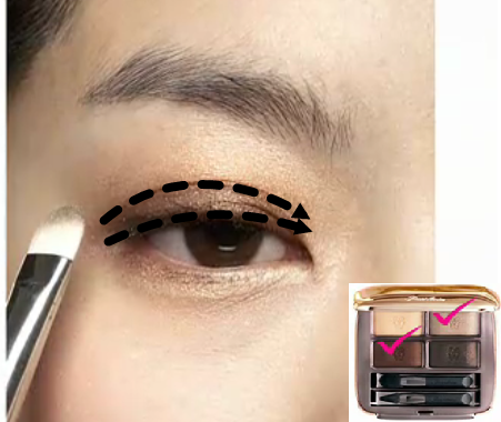 影音教學版 平面教學版 先以海棉推勻妝前乳 以粉底刷上粉底 為眼下遮瑕 上腮紅 以蜜粉做全臉打亮 香檳色打亮全眼窩 相同的顏色以扁平刷輕掃下眼線 混合兩棕色化眼摺處 以相同顏色做下眼尾及眼頭描繪 混合兩色化上眼線處 再以棕色或紅棕色眼線筆補滿上內眼線 以金黃色的眼線筆輕繪下眼線,由眼頭往眼中化 夾睫毛 上睫毛膏 化眉 化上紅棕色唇膏