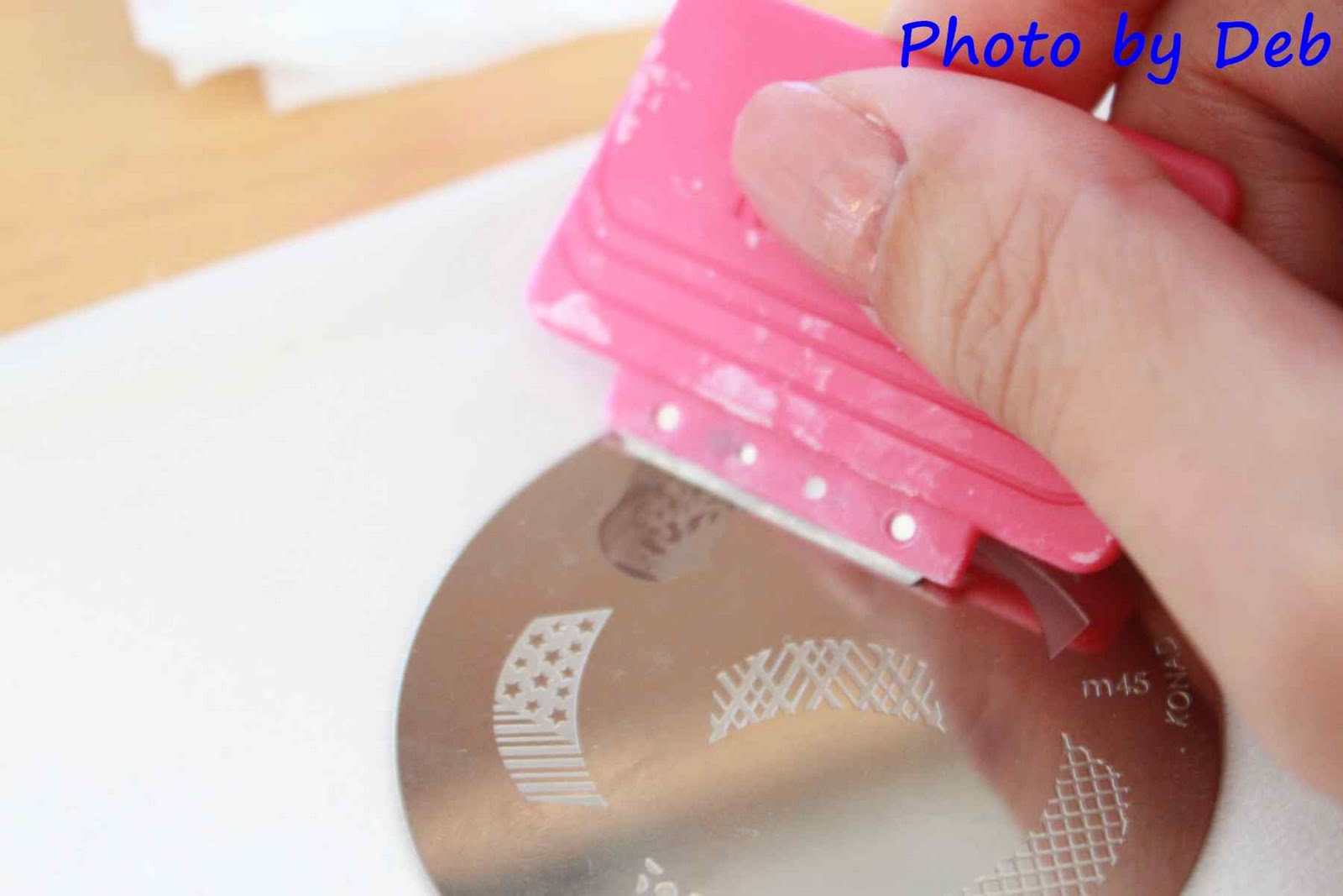 再用指甲油刮除器以斜角將顏料刮除