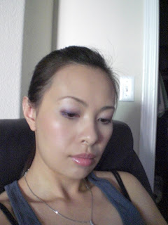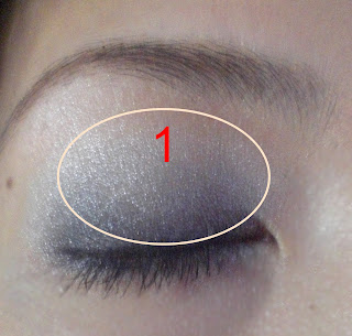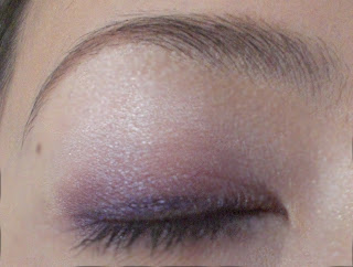 眼妝步驟:以1號(淺粉紅)化全眼窩以2號(深紫)化眼摺,由下往上暈至眼中1/2處以3號(紫色眼線膠)化上眼瞼