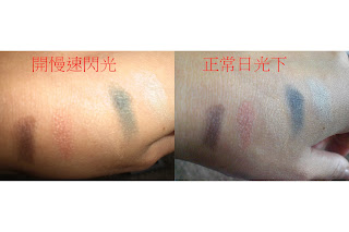 這一款的顏色都是很適合平常妝,顏色都很好搭配~~ 它的每個顏色都有摻雜一些亮粉,但不是那種誇張的亮,而且很內斂的亮…(形容的太深奧了…),對於上班或Party都很適合喔!看看在眼上試色: